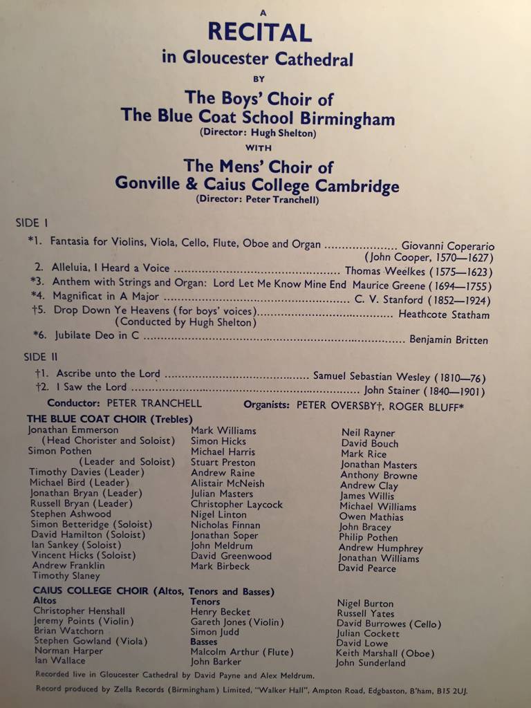 1974 LP of a recital in Gloucester Cathedral by the Boys' Choir of The Blue Coat School Birmingham with The Men's Choir of Gonville & Caius College, Cambridge.