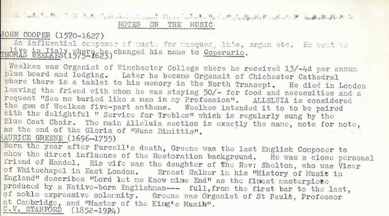 These notes were included with the album, as shown in the extract image below, written by "A.E.H & H.N.A.S" (believed to be Hugh Shelton and Anthony Harvey, a colleague of Hugh at Birmingham Bluecoat School and a key figure for many years in the Friends of Cathedral Music in Birmingham (Nigel Day, pers. comm.)).