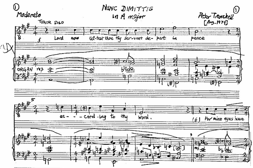 A setting of the Nunc Dimittis for tenor & bass solos, AATBrBB choir and organ, August1979, written for the choir of Gonville & Caius College, Cambridge.